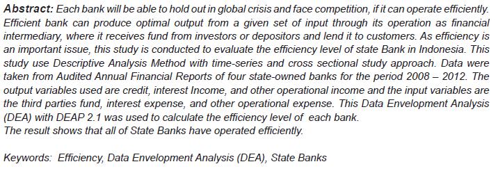 Colline, F., & Frederica, D. (2014). Tingkat Efisiensi Bank Persero di Indonesia. Ilmiah Manajemen Bisnis, 14(1). Retrieved from https://ejournal.ukrida.ac.id/index.php/IMB/article/view/865