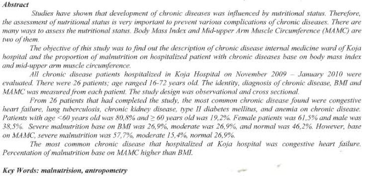 Ndraha, S., Tan, H. T., Siwabessy, M. R., & Santoso, M. (2014). Status Antropometri pada Pasien Penyakit Kronik di Bangsal Rawat Inap RSUD Koja. Jurnal Kedokteran Meditek, 16(43B). https://doi.org/10.36452/jkdoktmeditek.v16i43B.883