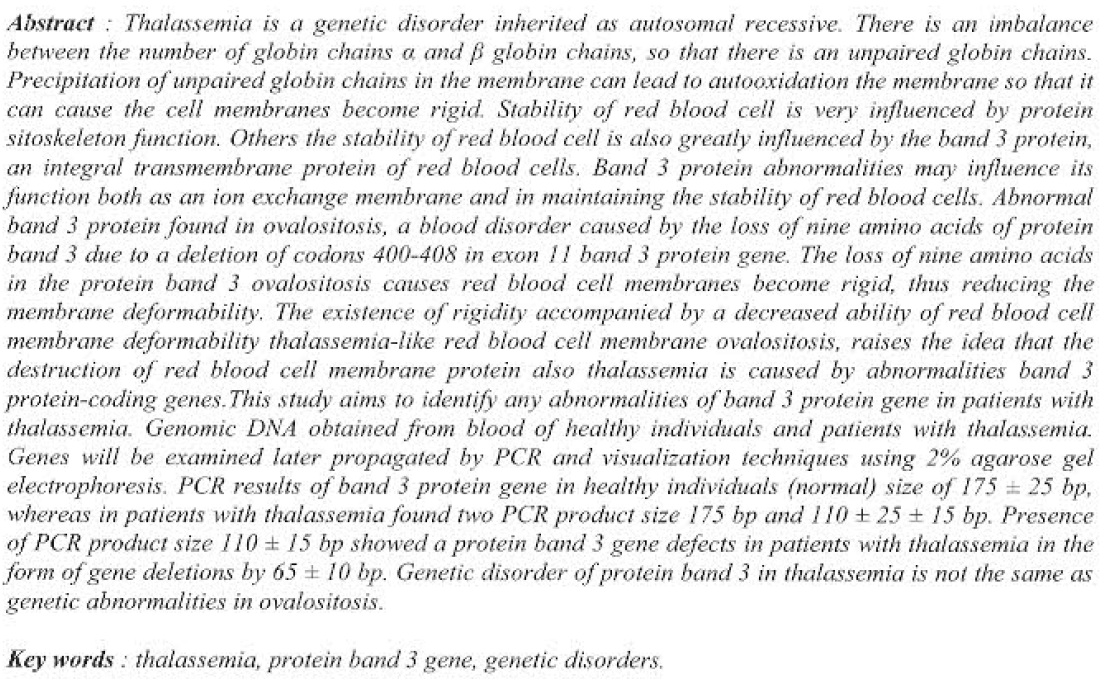 Abstract : Thalassemia is a genetic disorder inherited as autosomal recessive. There is an imbalance Between the number of goblin chains α and b globin chains, so that there is an unpaired globin chains. Precipitation of unpaired globin chains in the membrane can lead to autooxidation the membrane so that it Can cause the cell membranes become rigid. Stability of red blood cell is very influenced by protein sitoskeleton function. Others the stability of red blood cells is also greatly influence by the band 3 protein, an integral transmembrane protein of red blood cells. Band 3 protein abnormalities may influence its function both as an ion exchange membrane and in maintaining the stability of red blood cells. Abnormal band 3 protein found in ovalositosis, a blood di sorder caused by the loss of nine amino acids of protein band 3 due to a deletion of codons 400-408 in exon 11 band 3 protein gene. The loss of nine amino acids in the protein band 3 ovalositosis causes red blood cell membranes become rigid, thus reducing the membrane deformability. The existence of rigidity accompanied by a decreased ability of red blood cell membrane deformability thalassemia-like red blood cell membrane ovalositosis, raises the idea that the destruction of red blood cell membrane protein also thalassemia is caused by abnormalities band 3 protein-coding genes. This study aims to identify any abnormalities of band 3 protein gene in patients with thalassemia. Genomic DNA obtained from blood of healthy individuals and patients with thalassemia. Genes will be examined later propagated by PCR and visualization techniques using 2% agarose gel electrophoresis. PCR results of band 3 protein gene in healthy individuals (normal) size of 175 ± 25 bp, whereas in patients with thallasemia found two PCR product size 175 bp and 110 ± 25 ± 15 bp. Presence of PCR product size 110 ± 15 bp showed a protein band 3 gene defects in patients with thalassemia in the form of gene deletion by 65 ± 10 bp. Genetic disorder of protein band 3 in thalassemia is not the same as genetic abnormalities in ovalositosis.