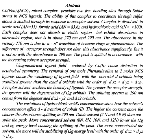 The Potency of CO(Fen)2(NCS)2 Mixed Complex As Indicator of Solvent Acceptor Strenght